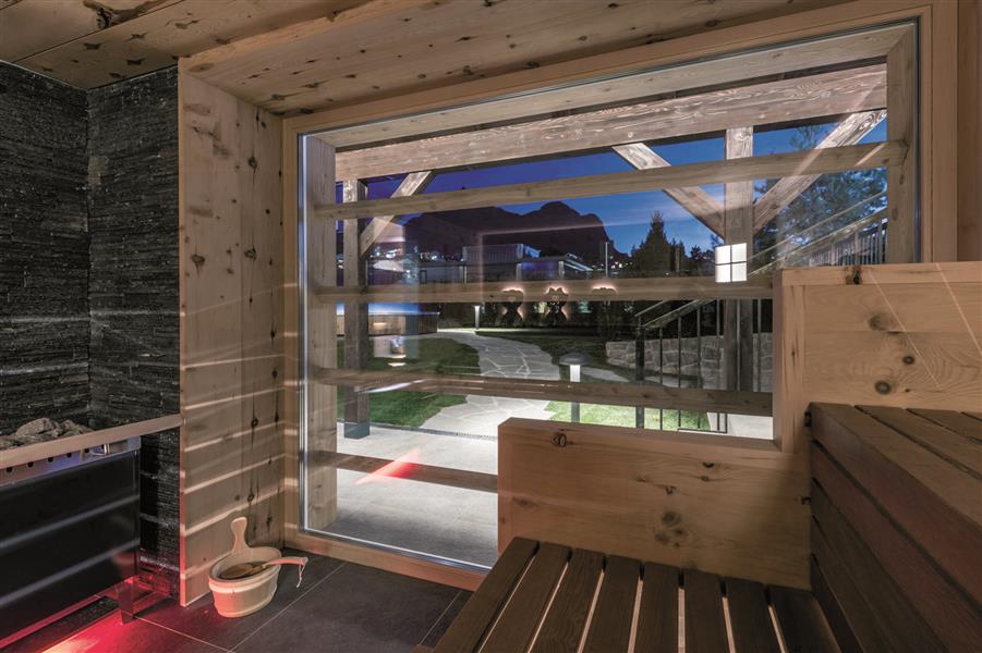 Also: lift, bar, sports equipment storage, garden and sun terrace, parking. Sauna with large panoramic window and fresh water and aromatic teas available all day. Bio sauna and Jacuzzi in the garden.