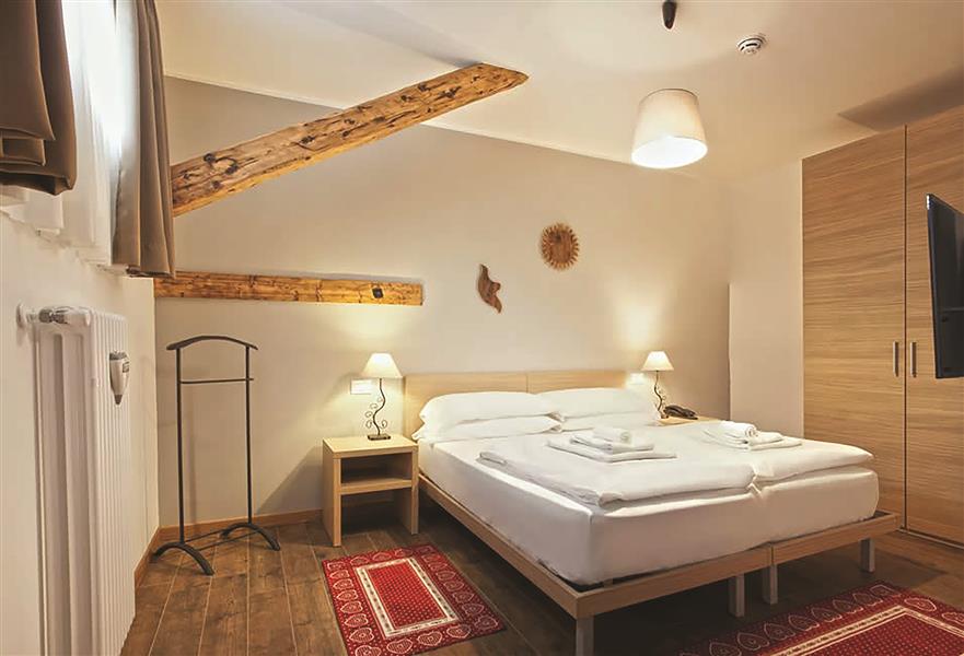 Standard (max 2 persons, 28 sqm) with two single beds or double bed. Perfect for couples in love or for those who want to share a room with a friend.  Standard with views of the Dolomites (max 2 people, 32sqm) offers a fantastic panoramic view of the Dolomites.  Standard with balcony and view of the Dolomites (max 3 people 32 sqm) on the third floor. From the large private balcony you can enjoy the panoramic view of the Dolomites.  Ground floor apartment with views of the Dolomites (up to 4 people 54 sqm) has a living area with panoramic views of the Dolomites. Suitable for those who want to have their pet with them.  Deluxe with balcony and view of the Dolomites (max 4 people 43 sqm perfect for a week with family or for those who simply want more comfort.  Bay with balcony and view of the Dolomites (max 5 people 56 sqm) with two private balconies.  Superior with balcony and view of the Dolomites (max 6 people 54 sqm) has two bedrooms and a living room with sofa bed.  Presidential with balcony and views of the Dolomites (max 7 people 93 sqm) attic with exclusive entrance, two bedrooms and living room with sofa bed, with traditional wooden beams on the ceiling.